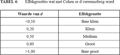 Tabel 3 toon 'n hoë statisties beduidende verskil in die houding teenoor persone met gestremdhede voor en ná die toepassing van die leerintervensie vir die eksperimentele groep (pd"0,001). Verder is daar geen statisties beduidende verskil in die houding teenoor persone met gestremdhede voor en ná opleiding van die kontrolegroep nie. Volgens Cohen se d (in Becker 2013) lei die beduidende verskil tussen die voor- en natellings in die eksperimentele groep tot 'n effekgrootte van 0,79. Volgens tabel 4 het dit 'n medium tot groot effekgrootte gehad.