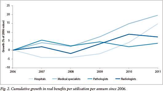 Medical schemes and their members have seen benefit expenditure rise steadily at a rate above inflation. Fig. 1 presents the claim costs per average beneficiary per annum for each year from 2006 to 2011. The graph highlights the direct impact of pathology cost increases over the period. Fig. 1 reveals a trend of increasing benefit costs for medical schemes. This increase is equivalent to an average increase of 8.94% (1.84% above inflation) per annum from 2006 to 2011. Pathology costs have also increased in this period with their share of total claim costs increasing, from 4.2% in 2006 to 4.7% in 2011.
