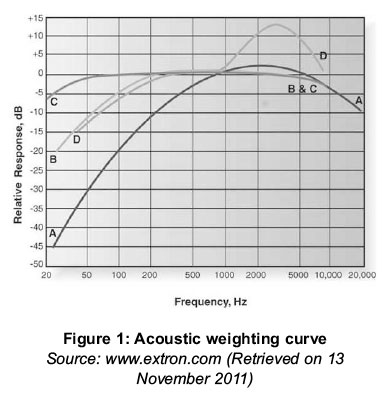 A-weighting, denoted by dBA, is a filter that is often related to SPL. It decreases or amplifies certain frequencies. This is in accordance with the international standards to approximate the frequency dependence of average human hearing. A-weighting readings are intended for measurements of low-level sounds (e.g. environmental noise and industrial noise) (Howe, Gastmeier and McCabe, 2007).