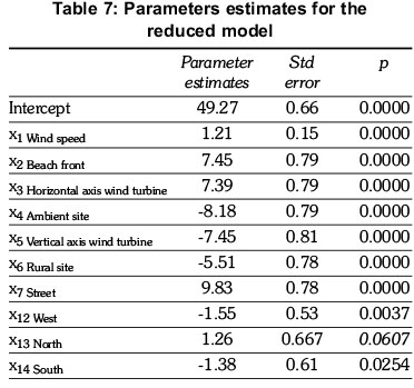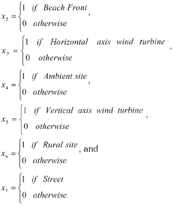 where y, the response variable, is the average sound level (dBA). The independent variable, x1= wind speed (m/s) is quantitative, and the independent variables site, time, wind direction and distance, coded as binary response variables, are qualitative. The seven sites are coded as