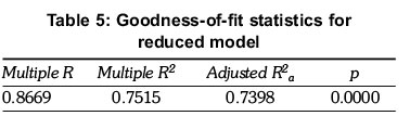 In Table 5 is the summary of goodness-of-fit measures of the reduced model, as well as the significance level of the overall models' fit.