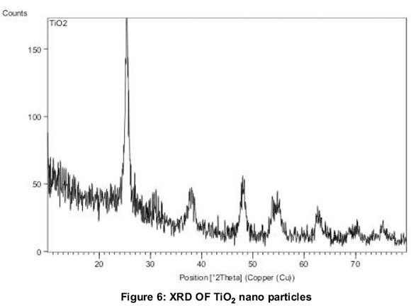 1. TiO2 nanoparticles were prepared by the sol-gel method. XRD results show that TiO2 particles have an anatase phase and is crystalline in nature with crystallite size of 42.77 nm.