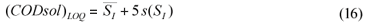 The limit of detection is generally defined as the concentration which gives an instrument signal (y) significantly different from the blank signal. Typically, the sample signal should be greater than the mean blank signal plus three times the blank signal standard deviation, i.e., LOD = yB+3sB (Miller and Miller, 2002). Considering CODsol as the method 'signal', then effluent CODsol (i.e., SI) can be considered a blank for the method, since it nominally corresponds to zero SS, and its 'signal' is subtracted to the influent sample signal ((CODsol)WW) (see Eq. (2) and (4)). So, for an SS value to be detectable, wastewater CODsol should be significantly higher than effluent CODsol. Accordingly, the CODsol corresponding to the limit of detection was computed as the mean SI plus 3 times the standard deviation of SI (Eq. (15):