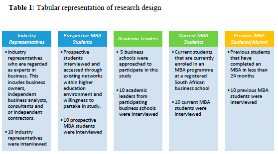 Academic leaders from various business schools were selected for this study as they represent an institutional view of the intended outcome of programmes such as the MBA. These representatives were involved in the management or leadership of MBA programmes at their respective institutions. Academic leaders also provided insight from an institutional perspective as to whether programmes such as the MBA are developing individuals for the future world of work.