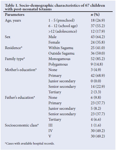 Ages ranged between 12 months and 16 years with a mean (SD) of 8.7 (4.2) years. There were 43 (64.2%) boys and 24 (35.8%) girls, giving a male:female ratio of 1.8:1. Table 1 shows the socio-demographic features of the initial 67 children; the majority were aged 6-12 years (37; 55.2%), resided outside Sagamu (36; 59%), belonged to a monogamous family setting (52; 85.2%), had poorly educated parents (mothers; 73.8% and fathers; 55.7%) and belonged to the lower socioeconomic classes IV and V (60; 98.4%).