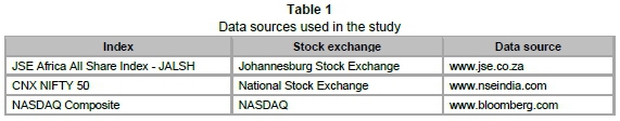 Second, India accounts for over 17.5 per cent of the world's population4 and its huge domestic market forms the basis of its rising global importance. India is expected to be one of the significant global economic powers in the years ahead. It hosts the second largest number of listed companies after the USA (Mohanasundaram & Karthikeyan, 2012). The NIFTY index of the National Stock Exchange of India (NSE) was considered for the study because it is the largest stock exchange in India in terms of daily turnover and the number of trades5 The NSE is also the world's largest exchange by EOB (Electronic Order Book) number of trades.6 Thirdly, the influence of the US economy and its stock market on the global markets is well known and well documented, which is evident from the literature provided. Apart from this, the higher level of liquidity of the US Dollar enhances the prime position of the US stock market on the global stage. The trade volume between India and the US was $93 billion in 2012.7 The NASDAQ index was selected for the study because it is one of the major world stock indices.