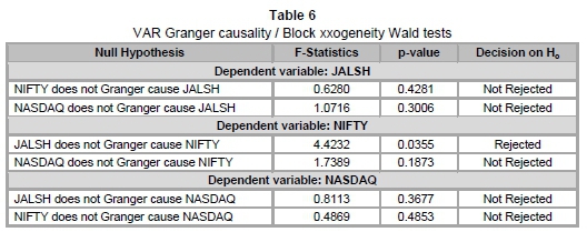 Prior to econometric analysis, a correlation test is carried out between JALSH, NIFTY and NASDAQ, as this gives preliminary insight into the existence of comovement among the time series variables. Table 4 displays the correlation coefficients between the three stock-market indices.y