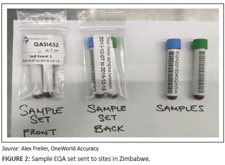 An automated EQA proof-of-concept pilot for CD4 counts was conducted in November 2015 in Manicaland Province in Zimbabwe. Several issues had to be resolved among different partners before the proof-of-concept testing could be initiated. A standardised barcoding format had to be agreed upon for use as the sample ID for testing on the Pima CD4 instrument. The barcode standardisation was necessary so that the informatics systems would be able to differentiate EQA samples from patient results to ensure that no patient data is transmitted beyond the clinical boundaries defined in these structures (Figure 3).