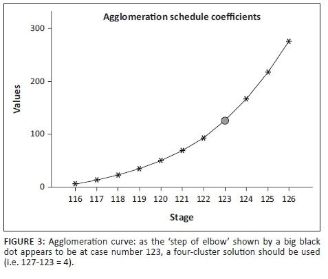 A four-cluster solution was discerned through hierarchical agglomerative CA (Figure 3).