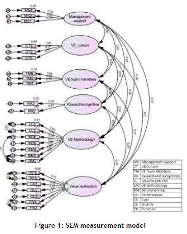 The structural equation model in Figure 2 indicated the variables linkages and relationships for a VE model for SOEs. The linkages showed that the VE team members and reward and recognition variables needed to be strengthened to have a positive impact on management support, which in turn would have an impact on VE culture and VE methodology, leading to value realisation.
