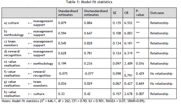 Given that the measurement model fit was adequate, the structural model could be implemented and the hypothesis tested. To determine the nature of the variables, the CR for all interactions other than (f) and (g) were greater than 1.96 and p<0.05, confirming that all covariances other than (f) and (g) were significant [26]. The Pearson product-moment correlation coefficient (PPMCC) is a standard measure to gauge the relationship strength between variables, ranging from -1 to +1 [7]. Correlation significance should be evaluated according to its strength, where 0.10, 0.30, and 0.50 are labelled as 'small', 'medium', and 'large' correlations in behavioural science [6].