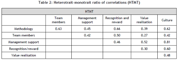 Construct reliability was verified, as all values of CR were > 0.7, except for culture [9]. The factor loading scores for all variables ranged from 0.56 to 0.9, as shown in Table 1. While factor loadings above 0.7 are better, the average variance extracted (AVE) values were all above 0.5, and composite reliability (CR) > AVE for all constructs, thus verifying convergent validity. According to Kline [14], discriminant validity is assessed by calculating the heterotrait-monotrait ratio of correlations (HTMT). Values under 0.85 indicate that discriminant validity is established. In Table 2, the HTMT values across pairwise constructs are all below 0.85, the maximum being 0.81 between management support and culture. Thus discriminant validity was verified.