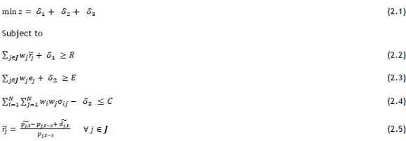 Equation (2.1) minimises the degree to which the three goals are not met, with δ1, δ2, δ3 calculated in Equations (2.2) to (2.4). The aggregation is possible, as the ROR, exchange flow ratio, and risk variables are all normalised ratios. The portfolio's ROR and liquidity is calculated by Equations (2.5) and (2.6) respectively. The covariance values are calculated outside the model and then incorporated into Equation (2.4). Equation (2.8) ensures that the portfolio is fully invested, while equations (2.9) and (2.10) ensure that only companies that are selected have a portion of the portfolio invested in them.