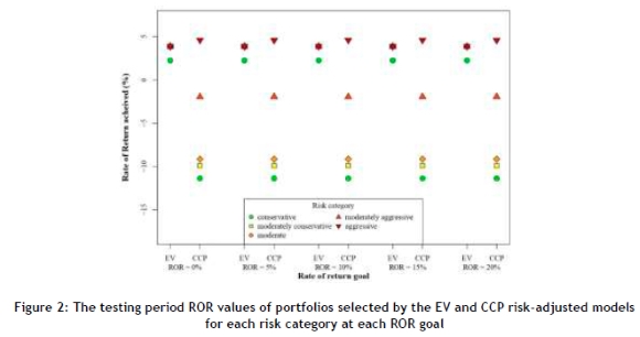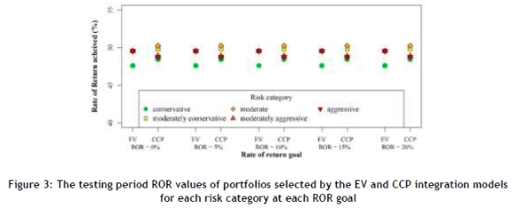 In contrast with the above results, all of the portfolios selected by the integration model achieved higher ROR values than the JSE all share index and any of the unit trusts that fall into the same risk category. Furthermore, for the moderately conservative, moderate, and aggressive risk categories, the selected portfolios outperformed the unit trusts by at least 20 percent, which is substantial. Thus, it is clear that this model significantly outperformed the market as well as existing investments, making these portfolios not only attractive but also preferable over the market and unit trusts.