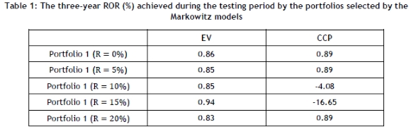 Given that investors are interested in their future returns, this study analysed the performance of the portfolios during an uncertain future period. The best-performing model during the testing period was the integration model that was solved using the CCP method. For the Markowitz, risk-adjusted, and exclusion models, all of the portfolios produced disappointing returns. The collective performance of these portfolios was dismal, with many losing money during the testing period. Not even the turbulent conditions of the South African equities market during the testing period could fully justify these results. The JSE all share index and South African unit trusts, which were exposed to the same turbulence, outperformed the portfolios by a generous margin.