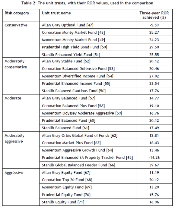 While poor market conditions could explain the poor performance of the majority of the model portfolios, the performance of twenty-five South African unit trusts indicates that, in practice, fund managers were still able to back 'winning horses'. Thus, twenty-five unit trusts across the five risk categories were selected for comparison. Unit trusts are developed and managed, taking into account the same three objectives as the models in this study: ROR, risk, and liquidity. Some unit trusts also take SRI into account, yet this is not standard practice. Table 2 lists the unit trusts used in the comparison according to their risk categories and their three-year ROR after fees.