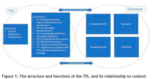The TIS framework, illustrated in Figure 1, is divided into two parts: structure and functions. The structure comprises actors, networks, and institutions. Functions are core processes in a TIS that are complementary to the structure [8]. The functions of interest in this study are 'knowledge development', defined by Bergek et al. [9] as the act of learning and the activities in which learning takes place; and 'knowledge diffusion through networks', which describes the exchange of information within and between networks, extending to activities of learning by doing, using, and interacting [10, 11]. The way in which the TIS is linked to its context may present in different forms, including that of the embedded TIS, geographical, sectoral, and political nature [12]. The TIS interacts with the context in one of two ways: 'structural couplings' or 'external links'. Structural couplings are shared elements (actors, networks, institutions, technology) between a TIS and a specific context structure; while external links are influences, resources, or assets shared between a TIS and a specific context, such as national innovation policy or market conditions.