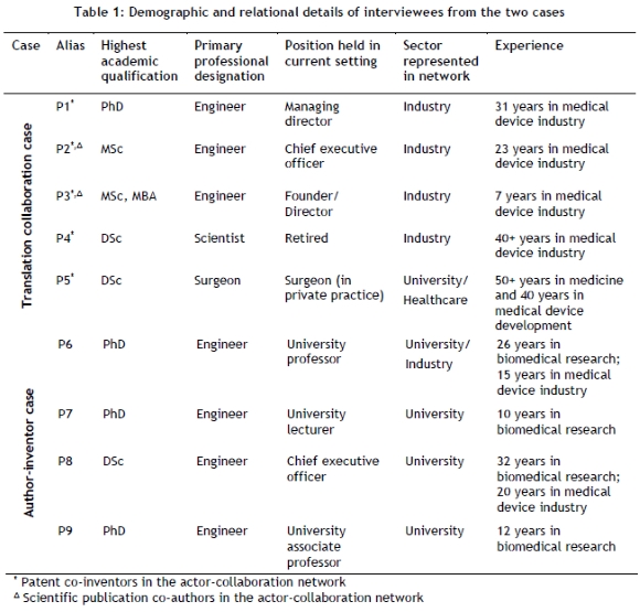 The demographic data of the interviewees are presented in Table 1. Interviewees are referred to by aliases, in the chronological order of the interviews (P1, P2, etc.). Discussions initially focused on the development phase of orthopaedic devices, and how knowledge is created and exchanged among actors. The interviewees' experiences also revealed insights into the manufacture and commercialisation of devices.