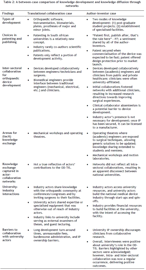 The interviewees described different types of inter-sectoral collaboration, and they acknowledged that successful innovation arises from collaboration across sectors, particularly between engineers/technicians and surgeons. Inter-sectoral knowledge exchange is largely tacit, including conferences and congresses, operating theatres and mechanical workshops, thesis examinations, and lecturing. Both cases reported developments in the absence of a specific sector. In the translational collaboration case, the interviewees mentioned that developments largely occurred in the absence of university actors; in the author-inventor case, developments occurred in the absence of industry actors. In both cases, however, the healthcare actor was highlighted as being a significant actor in the development of orthopaedic devices. The proposition of inter-sectoral collaboration supporting orthopaedic device development was shown in the actor collaboration networks [16,17] and in the available literature [31, 32]. Locally, Chimhundu et al. [4] found that inter-sectoral collaboration between the university and healthcare sectors was the most prominent collaboration type in scientific knowledge production for cardiovascular medical device development in South Africa, while de Jager et al. [5] found that the university and healthcare sectors collaborated extensively both intra- and inter-sectorally in developing medical devices in South Africa.
