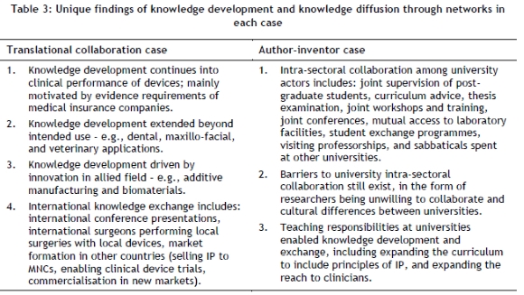 The findings related to knowledge functions that were unique to each case are presented in Table 3. In the translational collaboration case, knowledge was created in the clinical performance of the device, predominantly through the device support evidence required by medical insurance companies. Knowledge was also developed by expanding the applications of the device beyond its intended use, and knowledge was positively enhanced by innovation in other fields (e.g., additive manufacturing and biomaterials). These findings reveal the nature of developments and the influence of industry actors. In the author-inventor case, knowledge development and exchange were largely initiated by intra-sectoral collaboration opportunities. The teaching responsibilities of university actors also advanced knowledge development. Barriers to university intra-sectoral collaboration still exist in the form of researchers being unwilling to collaborate and of cultural differences between universities.