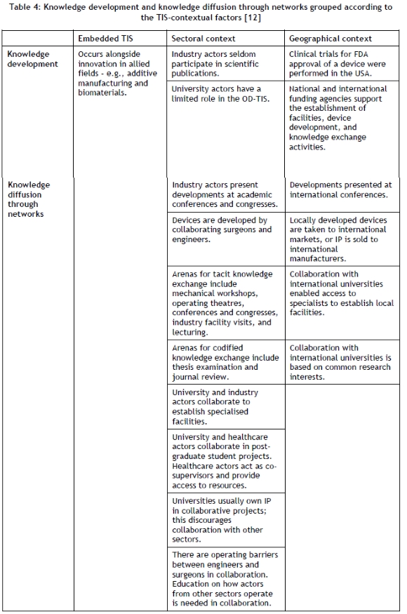 Through the explicit consideration of context, an increased understanding of technology development in a TIS is achieved, and provides a basis for the classification, generalisation, and transfer of findings, which is important for TIS-based policy development. The TIS is structurally coupled to the embedded and sectoral contexts, and externally linked and structurally coupled to the political context. Sectoral dynamics influenced both forms of knowledge production. Science council actors such as the CSIR and SAMRC played a lesser role in creating knowledge, but were funders of medical device development and knowledge exchange initiatives, as well as creators of innovation pathways to facilitate technology transfer from publicly financed research. The bureaucratic nature of universities, accompanied by burdensome administration, dependence on an academic cycle, and unrealistic costs of research, discourages inter-sectoral collaboration. While healthcare actors are central to orthopaedic device development, they lack supportive institutions. This may be a deterrent to innovation by clinicians; however, a favourable pathway for healthcare actors to get their product to market - by serving as consultants to industry - was identified in the patent-collaboration networks [17].