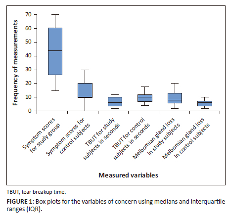 The TBUT is an indicator of tear film stability and a score of less than 10 s indicates an inadequate balance between aqueous and lipid layers of the tear film.17 The average TBUT score for our study group was significantly lower compared to that of the controls (7.95 ± 3.54 and 9.90 ± 3.70, respectively, P = 0.09). Generally, TBUT is regarded as a test for diagnosis of evaporative dry eye but is more relevant in the diagnosis of MGD as the core mechanisms of dry eye is tear instability, which is dependent on meibomian gland function.1,6 A low TBUT implies a possibility of the compromised tear film lipid layer, hence MGD, while a high TBUT measure is regarded as suggesting a normal lipid layer and healthy meibomian gland function.6 There is a source of variability in TBUT because of the volume of fluorescein to be delivered. It is unknown whether the moistened fluorescein strip should be shaken before installation and whether the strip should be applied on the superior, inferior, temporal, or nasal bulbar conjunctive or the tear meniscus. In this study the strip was placed on the temporal lower fornix of the conjunctiva.
