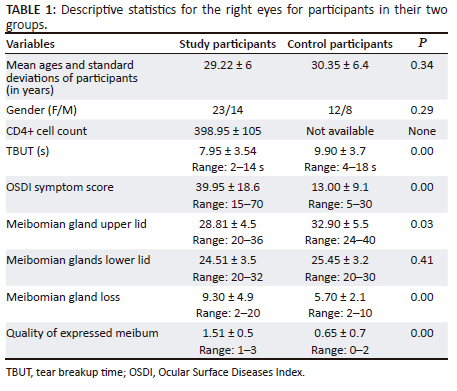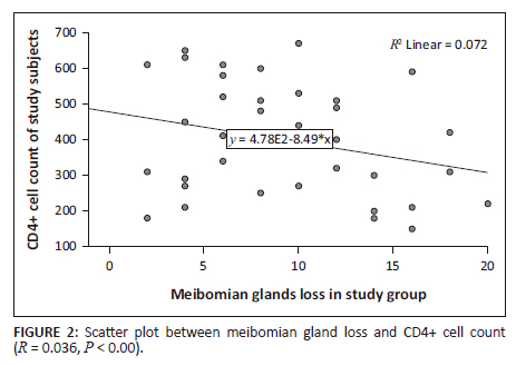 METHODS: This was a prospective study conducted with 37 HIV and AIDS participants and 20 healthy controls. All participants were assessed using the Ocular Surface Diseases Index (OSDI) score and, tear break-up time and lid margin regularity (using the slit-lamp biomicroscopy). The loss of the meibomian glands was evaluated using the Marx's line. For this study, this line represented a clinical parameter of meibomian function.