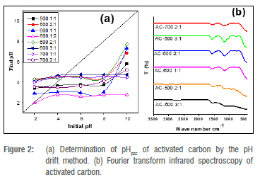 Point of zero charge (pHpzc) refers to the point at which the surface charge density generated on the surface of the adsorbent is zero. The examination of pHpzc offers an insight into the specificity of adsorption.34 Figure 2a represents the plot of initial and final pH values and the pHpzc is the point at which the curve of pH final vs pH initial intersects the line pHinitial pHfinal.35 The pHpzc values of ACs are concentrated in the range of 2-4.5, which indicates that the surface of the ACs are acidic and shows a clear correlation with the surface chemistry of ACs obtained from FTIR; such a character demonstrates good potential for the elimination of metals from contaminated water. Generally, the charges on the surface can be -YOH2+ or -YOH, or -YO-, which represents the protonated, neutral, and deprotonated sites on the surfaces of the ACs, respectively. If the pH value of the adjacent solute is lower than -YOH, the carbon material is positively charged (due to migration of the neighbouring H+ to the oxygen radical of AC) and more anions are adsorbed. However, a pH of the surrounding solute above -YOH introduces negatively charged surfaces (due to breaking H+ bonds in OH or COOH which exposes negative oxygen ions) promoting the removal of cations in aqueous solution. pHPZC is the point where -YOH2+ and -YO- are equal to zero. In generally, ACs with more oxygen-containing functional groups show lower pHPZC.36
