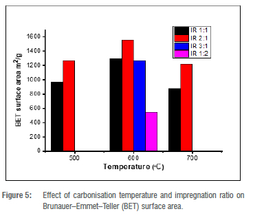 Temperature had a significant effect on the activation yield; increasing the temperature from 500 °C to 600 °C decreased the yield from 55.5% to 30.7%. The reason for this is that, at a higher carbonisation temperature, more acid and/or volatile substances will evaporate from the sample, thereby reducing the carbon yield.50 Yefremova et al.53 proposed that the decrease in the yield of carbonised products at higher pyrolysis temperatures may be due to the increase in the primary decomposition of the precursor and the increase in the secondary decomposition of the formed carbon material. Mussatto et al.49, Hayashia et al.54 and Wu et al.55 reported similar results from biomass materials. The effects of temperature and chemical ratio on BET surface area and average pore volume are shown in Table 2. As the activation temperature was increased from 500 °C to 700 °C, the surface area was observed to increase at a relatively low value of 961 m2/g, reaching a maximum value of 1560 m2/g at 600 °C, and then reduced reasonably to 875.8 m2/g at 700 °C. The decrease in the surface area at 700 °C may be due to the fact that the elastic limit and volume shrinkage at high temperatures make the acid habitually sedentary to support more pore development.56 The impregnation rate has a significant effect on the total pore volume, because the total pore volume increases rapidly with the increase of the acid/PKS ratio, regardless of the carbonisation temperature. The BET surface area and the average pore width (nm) of the ACs, respectively, increased from 961 m2/g and 1.53 nm to 1560 m2/g and 1.71 nm as the impregnation ratio increased from 1 to 2. This is because the increase in H3PO4 promotes the contact area between PKS and H3PO4, which increases the diffusion of H3PO4 into the pore structure which increases the porosity of the final product. The BET surface area and average pore width were then reduced to 1266 m2/g and 1.53 nm, respectively, at ratio 3. This is because the higher phosphoric acid concentration forms a protective layer that prevents the incorporation of the activator into the sample, thereby preventing any increase in the specific surface area and total pore volume.51 However, when the ratio (H3PO4/PKS) was reduced to 1:2, the total pore volume was significantly reduced to a minimum value of 0.02 cm3/g. This could be due to an insufficient amount of H3PO4, which could not activate the sample effectively.39 Similar behaviour has also been reported for the effect of the impregnation ratio on the porosity of ACs obtained by H3PO4 activation of other biomass.46,57 Compared to other ratios, the AC produced at 2:1 H3PO4 showed the strongest pore width of 1.71 nm. It can be concluded that an acid/precursor ratio of 2:1 is suitable for the formation of useful pore structures and that maintaining this ratio can lead to favorable development of porosity in ACs. The effects of carbonisation temperature and impregnation ratio on BET surface area are summarised in Figure 5.