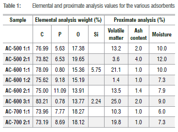 The major elements on the surfaces of the carbons, as examined through energy-dispersive X-ray spectroscopy, revealed that the adsorbents consist primarily of elemental oxygen and carbon with small amounts of phosphorus. Results of the elemental compositional analysis are presented in Table 1.