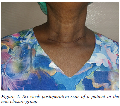BACKGROUND: The relevance of closing the platysma muscle layer after open thyroidectomy has received little interest in terms of research. The objective was to determine whether non-closure of the platysma muscle layer after open thyroidectomy impacts significantly on the cosmetic outcome of the resulting collar scar.