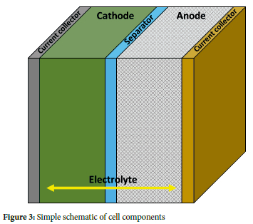 Batteries have a simple configuration of a positive electrode (cathode), negative electrode (anode), separator and electrolyte to allow for ion mobility during charging and discharging, as shown by the simple schematic in Figure 3.