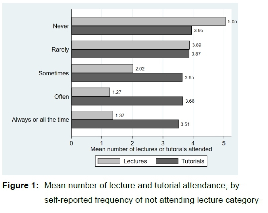 Figure 1 compares our digitally captured and the students' self-reported answers on lecture attendance. Mean lecture attendance (5.05) was much higher for those who claimed they never missed a class. In fact, this mean of 5.05 is statistically significant from the mean of other categories (at a significance level of 1%). On the other hand, mean tutorial attendance across these self-reported lecture attendance frequency categories was quite close (ranging between 3.51 and 3.95), and these means are not statistically different from one another.