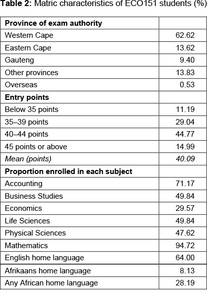 With regard to the students' school characteristics, Table 2 shows that more than 60 per cent of the ECO151 students matriculated in Western Cape schools, while mean entry points was 40.09. Overall, 82.5 per cent of the students enrolled at least one commerce subject, namely Accounting (71%), Business Studies (50%) and Economics (30%). Moreover, a very high share of 94.72 per cent enrolled Mathematics (instead of Mathematical Literacy) in Matric.