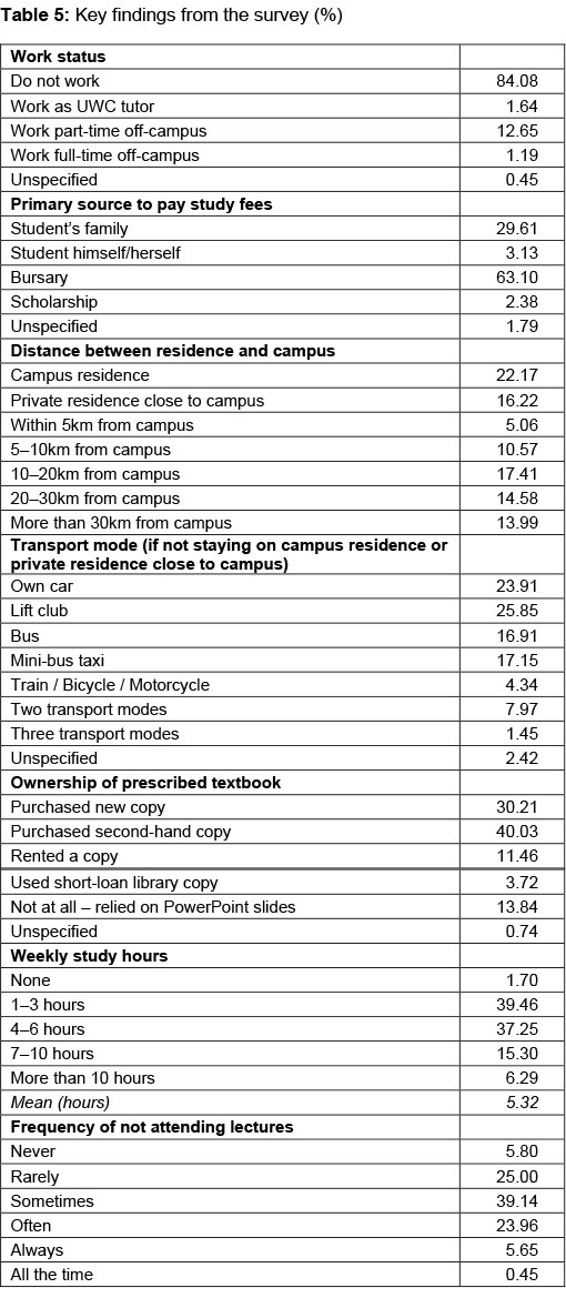 Table 5 shows key findings from the survey. First, about 15 per cent reported they were working at the time of the survey (weekly median and mean work hours were 10 and 17 respectively). About two-thirds relied on bursaries or scholarships to pay the study fees, while nearly 30 per cent relied on family members for financial support to pay the study fees.