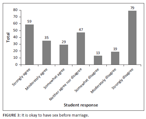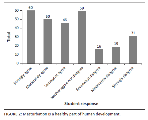 The attitudes of the students, described in Table 3, indicate the average opinion of the participants, favouring a perspective of agreement. The data in Figure 1 notes a binomial distribution. Attitudes range from more accepting of sexual behaviour to some students disagreeing. Two examples have been included: (1) 'Masturbation is a healthy part of human development' (Figure 2) and (2) 'It is okay to have sex before marriage' (Figure 3).