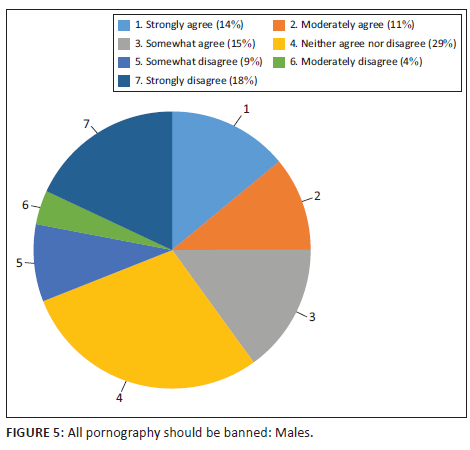 The gender bias is illustrated by one of the questions in the attitudes section of the SHEPS regarding pornography. The research team noticed the subsequent response distribution: 33% of the female-identified population felt very strongly that all pornography should be banned (Figure 4). In comparison, only 14% of the male participants felt this way (Figure 5). However, findings from previous studies indicate that 1 in 3 females in the 18-30 years age group consume pornography, and this figure has remained consistent from 1973 to 2010.25,26 We could expect the gender distribution of this answer to change as the students become older, and move beyond gender conforming attitudes. Nevertheless, understanding the gender dynamics in a classroom will help educators be sensitive with regard to students' personal and professional development.