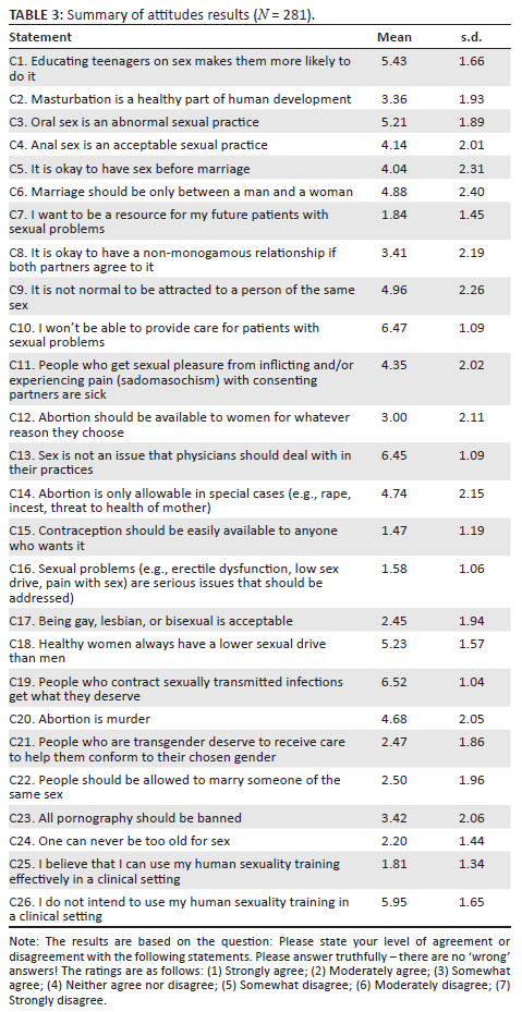 This section assessed students' level of agreement or disagreement to attitudes on 26 sexuality-related opinion statements. It was emphasised that there were no wrong answers. There are 26 unique statements in this section. Table 3 presents the mean and standard deviation of each.