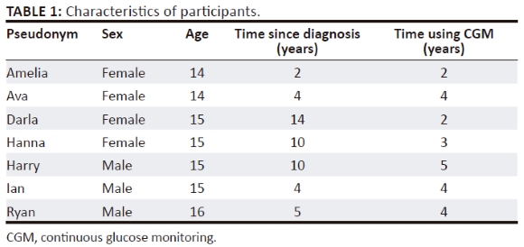 The target population included adolescents living with T1D using CGM. Recruitment was carried out at the Centre for Diabetes and Endocrinology (CDE) in Parktown, South Africa, which specialises in paediatric diabetes. Non-random purposive sampling was utilised to select participants that adhered to the following criteria: (1) adolescents aged between 12 and 17 years old; (2) diagnosed with T1D for more than 12 months preceding data collection and (3) who were patients at the CDE: Parktown, Johannesburg and (4) have been using CGM for more than 3 months. Furthermore, they needed access to an internet connection and be willing to participate in the online semi-structured interviews in English or Afrikaans. Adolescents undergoing psychotherapy at the time of the study were ineligible as the psychotherapeutic process might have had an impact on their perceptions of diabetes management. Adolescents living with another chronic medical condition were also ineligible as their lived experience of managing it might have affected their lived experience of managing T1D.