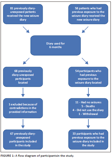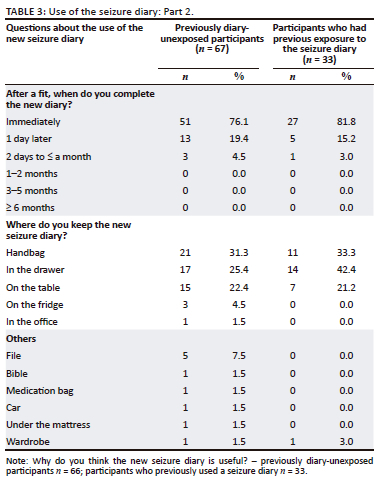METHODS: Adult patients with epilepsy attending Universitas Academic Hospital epilepsy clinic in Bloemfontein, clinics in Kimberley and the casualty department of Kimberley hospital (Robert Mangaliso Sobukwe hospital) received a new seizure diary. After using the diary for 6 months, participants (patients, relatives or caregivers) completed a questionnaire