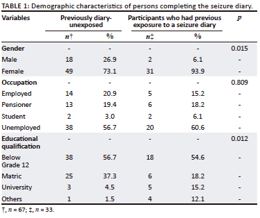 Table 1 indicates that most of the persons completing the diary were females, unemployed and had below Grade 12 education in both study groups. A statistically significant difference was found between previously diary-unexposed participants and participants who had previous exposure to a seizure diary regarding gender and educational qualifications.