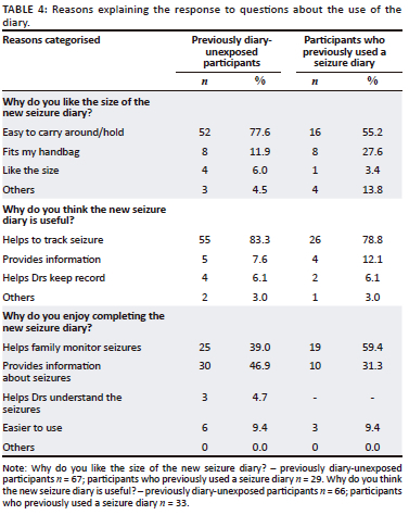 Table 4 shows that most of the participants from both groups were satisfied with the size of the new seizure diary because it is easy to carry around. A few participants who had previous exposure to a seizure diary (n = 4; 12.1%) reported that they did not like the size of the new seizure diary because 'It was too small to record in full' (n = 2; 50%), 'would like it to be bigger' (n = 1; 25%), and 'it was too long'(n = 1; 25%).