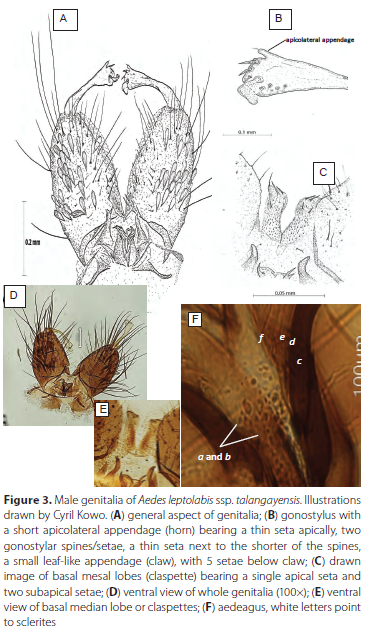 Male genitalia. Resembles Aedes leptolabis as described by Edwards (1941). Tergum IX is slightly indented in the middle creating appearance of two lobes with 5-7 long fine long setae positioned generally in two rows on each lobe. Gonostylus with short apicolateral appendage bearing apically a thin seta, 2 spines, one thin spine and a small leaf-like appendage (gonostylar claw) with five thin setae below claw (Figure 3A, B and D). Basal mesal lobe is covered with many fine setae and bears one apical and two more ventrally positioned quite stout subapical setae (Figure 3A, C and E) and two to three sub-medial setae. Gonocoxite length: 295.63 μm, Gonostylus (length = 189.51 μm, maximum width at club = 43.07 μm and width at narrowest point = 9.3 μm). Aedeagus about 85 μm in length consisting of on each side, ventrally two dark brown sclerites (Figure 3F (a and b)) and below a plate of four loosely connected light brown sclerites with the apical two sclerites much longer than the lower two (Figure 3F, (c to ƒ)), most basal denticle distinctly the darkest. The aedeagus sclerites are loosely connected and their relative positions often get distorted in slide mounts.