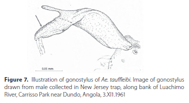 3. Gonostylus apex is covered in fine setae and appears as an elongated triangle extending outwards from the apicodorsdal appendage, fine setae along the upper edge of triangular extension and gonostylar claw at end of elongated extension (Figure 7)....................Ae. tauffliebi Rickenbach and Hamon - Apex of gonostylus otherwise more club-shaped...........4