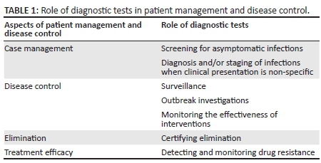 Accurate diagnostic tests play a key role in patient management and the prevention and control of most infectious diseases (Table 1). Early diagnosis and treatment not only reduces the risk of developing long-term complications in the patient, but for diseases such as tuberculosis, sexually-transmitted infections and HIV, prompt treatment also reduces further transmission to other members of the community.