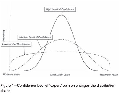 Expert opinion - if no proxy or empirical means existed, then expert opinion could be utilized. This can be done by getting inputs based on experience on the absolute 'minimum' and 'maximum' the specific variable could ever take, and what was the 'most likely' value expected. Engineers typically like to be accurate to the last decimal point, but this approach was accepted because an additional variable 'level of confidence' in the most likely value allowed the 'expert', for example, to express 'low-level confidence' in the 'most likely', which made the probability distribution 'uniform'. When the Monte Carlo simulation runs, that variable will yield a result that has an equal probability of being anywhere between the 'minimum' and 'maximum'.