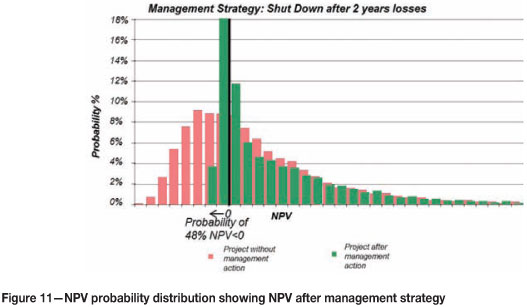 What was not apparent from the traditional NPV approach, though, was that the project had a 44 percent chance of an NPV below zero and therefore project financial failure. This came as quite a shock to the project team and management of the operation and was deemed too risky.