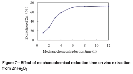 The effect of mechanochemical reduction time on zinc extraction is shown in Figure 7. As expected, the rate of zinc leaching increased with an increase in reduction time. Maximum extraction was achieved after about 6 hours.