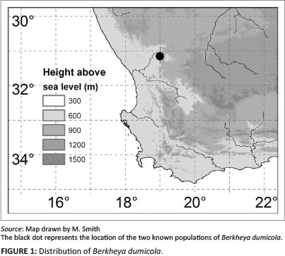 RESULTS: Berkheya dumicola N.G.Bergh & Helme was described from two subpopulations from the northern Bokkeveld escarpment, Northern Cape Province, South Africa. The species is a tall shrub with radiate flowerheads, toothed receptacle alveole margins, a uniseriate pappus of small, rounded scales and very short twin-hairs on the cypsela