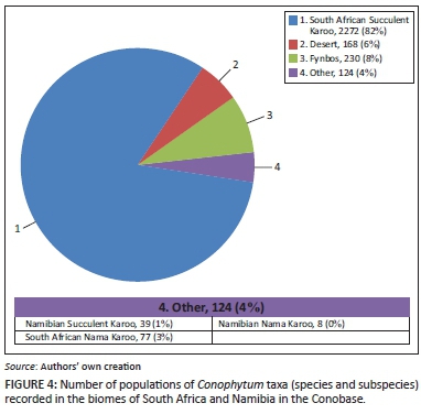 Mapping the distribution onto the recognised biomes of the region reveals a very strong association with the Succulent Karoo (Figures 2a and 2b). Almost 83% of all recorded Conophytum populations are located solely within this biome (Figure 4). The majority of the remaining observations are found within the Fynbos and Desert biomes, with fewer recorded populations in the Nama Karoo biome as it is currently geographically defined.